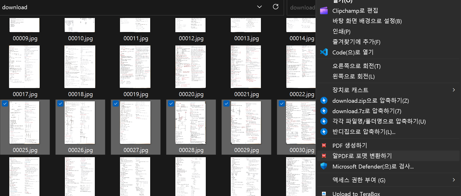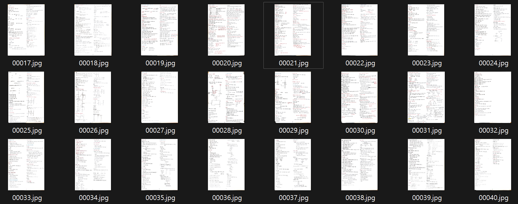 1. 필기 내용을 vflat 앱을 이용해 사진으로 찍습니다. PDF로 만들고자 하는 사진을 모두 선택해 '공유 - PC로 저장'을 통해 PC에 저장합니다. 종이 문서를 디지털로 변환하는 건 vflat을 이용하는 편이 가장 깔끔한 것 같습니다. 앱 자체에서도 PDF 변환을 지원하지만 무료인 경우 횟수 제한이 있어서, 다량의 PDF 파일로 변환해야 한다면 아래와 같은 방법을 사용할 수밖에 없습니다.