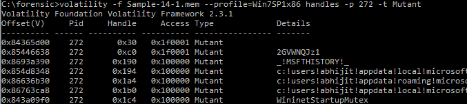 `Mutant` 핸들을 나열할 수도 있다. 2GVWNQJz1은 kuluoz 계열의 멀웨어임을 나타낸다.