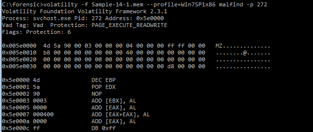 `malfind`는 VAD 트리를 분석해 다른 포르세스 삽입된 코드 인젝션을 찾아낸다.