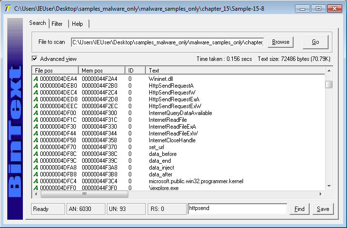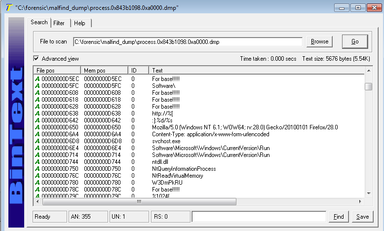 찾아낸 내용을 -D 옵션으로 덤프 파일로 저장한 후 Bintext로 확인하면, 레지스트리 경로나 For base!!와 같은 의심스러운 문자열을 확인할 수 있다.