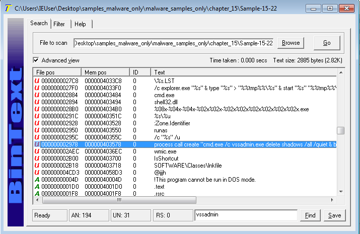 정적 문자열 분석을 해본다면, 백업 파일을 삭제하고 부팅 시 자동 복구를 비활성화하기 위해 vssadmin.exe delete shadows /all /quiet와 같은 명령이 포함되어 있는 것을 볼 수 있다.