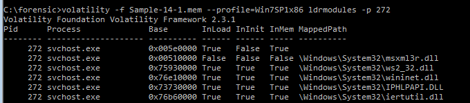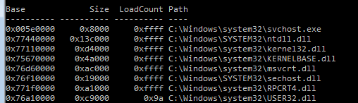 InInit이 False이고 MappedPath가 비어 있는 모듈은 정상적이지 않다. 아마도 프로세스가 정지 상태로 실행되었고, svchost.exe의 섹션/모듈은 매핑 해제되어 악성코드가 매핑되는 프로세스 할로잉이 있었을 것이다.