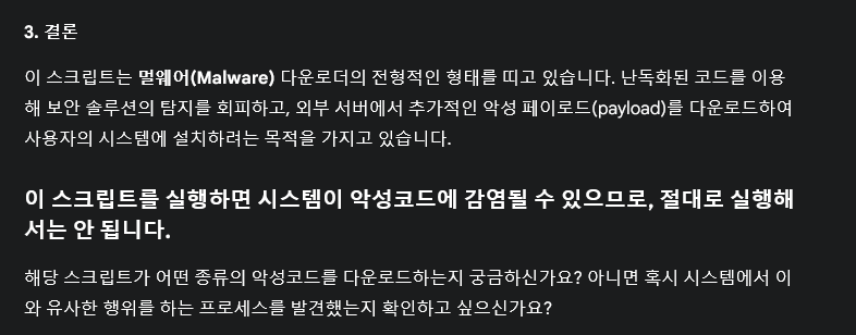 생성형 AI에게 질문하니 외부 서버에서 추가적인 악성 페이로드를 다운로드하는 다운로더라고 알려주었다.